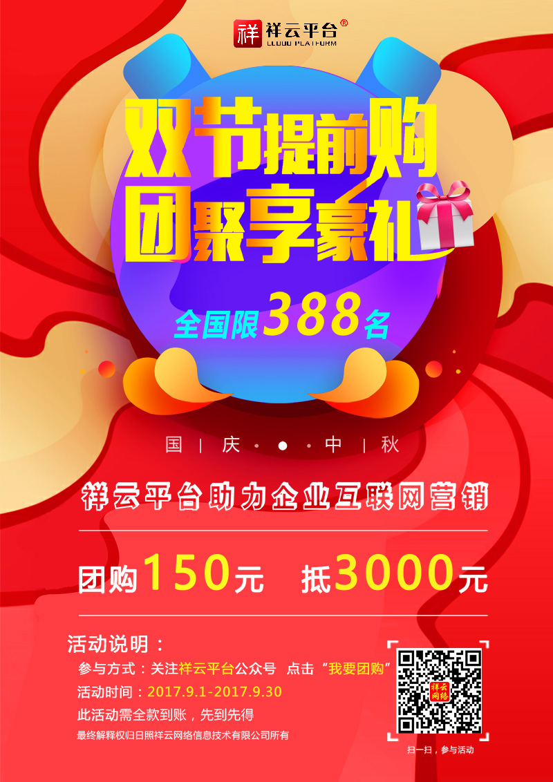 迎中秋,慶國慶,值此雙節(jié)來臨之際,祥云網(wǎng)絡(luò)助理企業(yè)互聯(lián)網(wǎng)營銷,團(tuán)購150元抵3000元。活動(dòng)進(jìn)行中……