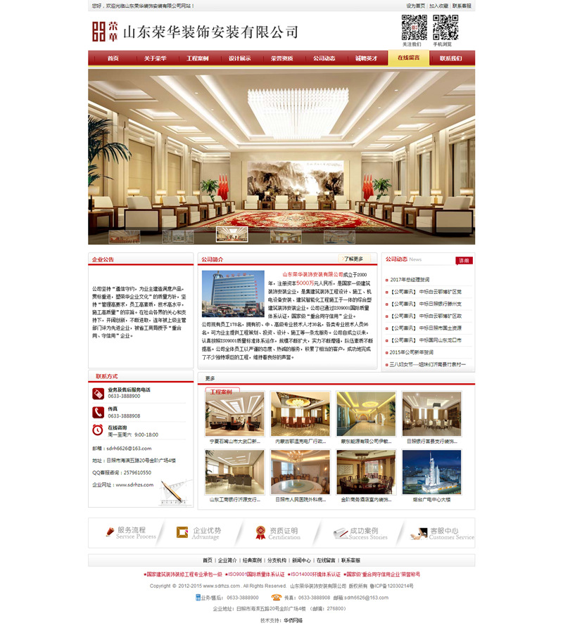 公司自成立以來,認(rèn)真按照ISO9001質(zhì)量標(biāo)準(zhǔn)體系運(yùn)作,規(guī)模不斷擴(kuò)大,實(shí)力不斷增強(qiáng),隊(duì)伍素質(zhì)不斷提高。公司全體員工以嚴(yán)謹(jǐn)?shù)膽B(tài)度、熱誠(chéng)的服務(wù),積累了相當(dāng)?shù)目蛻,成功的完成了很多艱巨的建筑安裝工程,維持著良好的聲譽(yù)。公司尊重知識(shí),尊重人才,開發(fā)技術(shù)力量,依靠科技進(jìn)步,創(chuàng)造自己的企業(yè)文化,激發(fā)員工的向心力和凝聚力。建立起了完善的集設(shè)計(jì)、施工、銷售、服務(wù)等為一體的時(shí)常經(jīng)營(yíng)體系。同時(shí),不斷加強(qiáng)企業(yè)內(nèi)部管理,實(shí)現(xiàn)了公司電腦網(wǎng)絡(luò)化管理。塑造品牌,重視信譽(yù),嚴(yán)把質(zhì)量關(guān),形成了一整套完善的施工管理和質(zhì)量保證體系,使榮華形成了一支凝聚力強(qiáng),能夠立足山東,面向全國(guó),高瞻遠(yuǎn)矚,積極向上的集體。“做精品工程,創(chuàng)榮華品牌”的經(jīng)營(yíng)理念使榮華的事業(yè)蒸蒸日上.我公司先后在省內(nèi)外承接了金階商務(wù)酒店室內(nèi)裝修工程、山東淄博市工商銀行沂源、南定、洪溝、臨淄、桓臺(tái)、胡田、王舍、唐索路等分理處室內(nèi)外裝飾工程、寧夏石嘴山市大武口新區(qū)行政及文化中心裝飾工程、蒙東能源有限公司伊敏河?xùn)|礦區(qū)第一煤礦辦公樓及宿舍樓裝飾工程、內(nèi)蒙古鄂溫克發(fā)電廠行政辦公區(qū)及輔助生活區(qū)裝飾工程、日照市人民醫(yī)院外科病房樓及生活服務(wù)中心室內(nèi)裝飾工程、山東省日照銀行莒縣支行辦公樓裝飾工程、安徽省合肥市安徽移動(dòng)大廈辦公樓室內(nèi)裝飾工程、山東日照市工商銀行市中分理處、山東省博物館新館(通風(fēng)空調(diào)安裝工程)、河南省人民醫(yī)院(通風(fēng)空調(diào)安裝工程)、山東大廈賓館樓(空調(diào)系統(tǒng)及主供電系統(tǒng)安裝工程)、西安海關(guān)緝私辦公大樓(裝飾、空調(diào)工程)、西安中建西北設(shè)計(jì)院(安裝及部分裝飾工程)、日照市人民醫(yī)院特需病房樓(智能化安裝工程)、日照市會(huì)展中心(音響視頻會(huì)議系統(tǒng)設(shè)計(jì)及安裝調(diào)試工程)、日照永發(fā)房地產(chǎn)風(fēng)景水岸花園G5#G6#(外墻保溫屋面保溫工程)等大、中型室內(nèi)外裝飾安裝工程共40余項(xiàng),完成的工程涵蓋黨政、金融、企業(yè)、酒店、醫(yī)院、房地產(chǎn)類等眾多領(lǐng)域。工程一次驗(yàn)收合格率達(dá)100%,優(yōu)良率達(dá)96%。