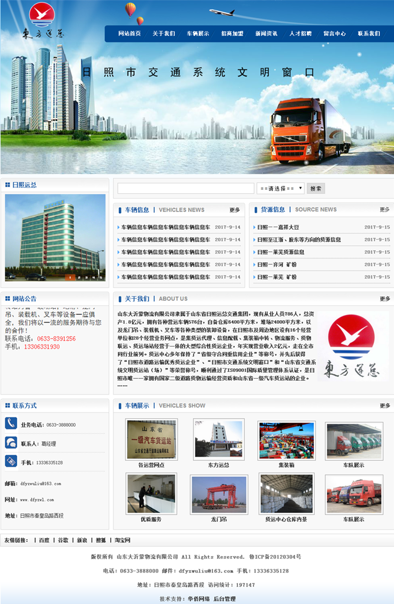 山東大沂蒙物流有限公司隸屬于山東省日照運(yùn)總交通集團(tuán),現(xiàn)有從業(yè)人員786人,總資產(chǎn)1.8億元,擁有各種營運(yùn)車輛576臺(tái),自備倉庫6400平方米,堆場24000平方米,以及龍門吊、裝載機(jī)、叉車等各種類型的裝卸設(shè)備,在日照市及周邊地區(qū)設(shè)有16個(gè)經(jīng)營單位和28個(gè)經(jīng)營業(yè)務(wù)網(wǎng)點(diǎn),是集貨運(yùn)代理、信息配載、集裝箱中轉(zhuǎn)、物流服務(wù)、貨物聯(lián)運(yùn)、貨運(yùn)場站經(jīng)營于一體的大型綜合性貨運(yùn)企業(yè),年實(shí)現(xiàn)營業(yè)收入2億元,走在全市同行業(yè)前列。貨運(yùn)中心多年保持了“省級守合同重信用企業(yè)”等稱號,并先后獲得了“日照市道路運(yùn)輸優(yōu)秀貨運(yùn)企業(yè)”、“日照市交通系統(tǒng)文明窗口”和“山東省交通系統(tǒng)文明貨運(yùn)站(場)”等榮譽(yù)稱號,順利通過了ISO9001國際質(zhì)量管理體系認(rèn)證,是日照市唯一一家擁有國家二級道路貨物運(yùn)輸經(jīng)營資質(zhì)和山東省一級汽車貨運(yùn)站的企業(yè)。